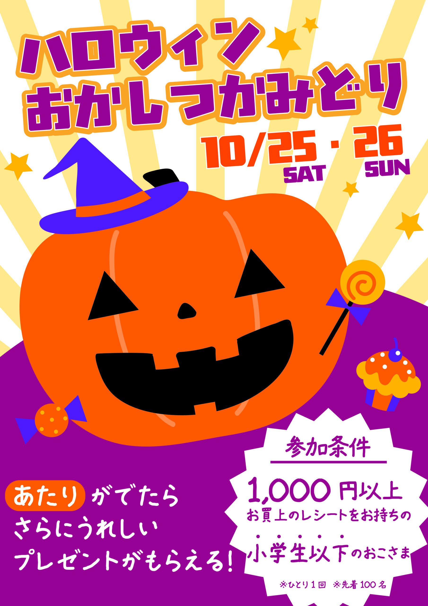 10/25・26【ハロウィンおかしつかみどり🎃】 カテゴリ: イベント もうすぐハロウィン!🎃 ということで、10月25日(土)・26日(日)の2日間でハロウィンイベント『おかしのつかみどり』を開催します😺 店内で1,000円以上お買い上げのレシートをお持ちの ”小学生以下”のおこさまが対象となります。 つかんだお菓子の中に『あたり』があったら、さらに嬉しいプレゼントがもらえます🎁 ぜひお立ち寄りください♩